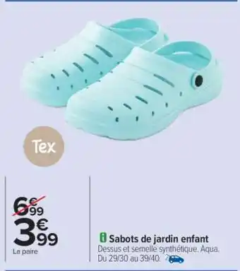 En plus de l'offre Sabots de jardin enfant, Carrefour propose une large gamme de produits. Consultez le Catalogue Carrefour hebdomadaire pour découvrir les meilleures offres et promotions. En plus de Sabots de jardin enfant, il y a aussi : Tex - sabots de jardin enfant, Sabots enfant & Sabots de jardin adulte.
