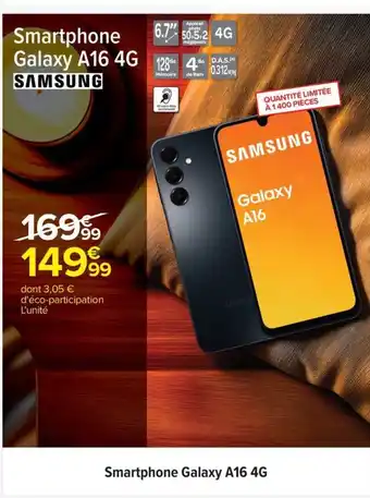 Cette SAMSUNG Smartphone Galaxy A16 4G est maintenant disponible chez Carrefour. Découvrez toutes les promos en cours et profitez de réductions intéressantes. Commandez SAMSUNG Smartphone Galaxy A16 4G en ligne via le site officiel de Carrefour ou achetez-la en magasin à un prix avantageux. Promocatalogues.fr réunit chaque jour les meilleures offres liées à SAMSUNG Smartphone Galaxy A16 4G. Envie d’être informé en premier ? Activez l’alerte en cliquant sur la cloche pour recevoir une notification gratuite dès que ce produit revient en promotion.Questions fréquemment posées au sujet de SAMSUNG Smartphone Galaxy A16 4G