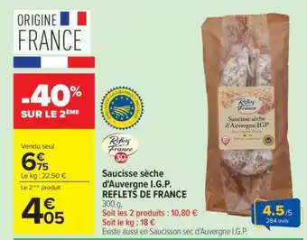 Actuellement en offre chez Carrefour : Saucisse sèche d'Auvergne I.G.P. REFLETS DE FRANCE ✅ Valable du 21-04 au 4-05.