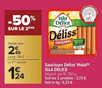 En plus de l'offre Saucisses Déliss' Halal, Carrefour propose une large gamme de produits. Consultez le Catalogue Carrefour hebdomadaire pour découvrir les meilleures offres et promotions. En plus de Saucisses Déliss' Halal, il y a aussi : Saucisses Déliss' Original Halal, Isla délice saucisses déliss' halal & ISLA DÉLICE Saucisses Déliss Original Halal.
