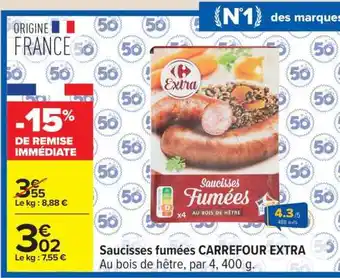 En plus de l'offre Saucisses Fumées Carrefour Extra, Carrefour propose une large gamme de produits. Consultez le Catalogue Carrefour hebdomadaire pour découvrir les meilleures offres et promotions. En plus de Saucisses Fumées Carrefour Extra, il y a aussi : Carrefour extra saucisses fumées, 4 saucisses fumées CARREFOUR Le Marché & Carrefour - 4 saucisses fumées le marché.