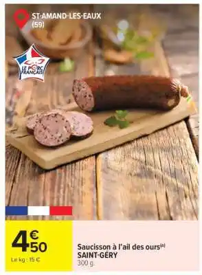 Actuellement en offre chez Carrefour : Saucisson à l’ail des ours SAINT-GÉRY ✅ Valable du 17-02 au 4-03.