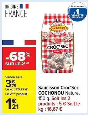 Actuellement en offre chez Carrefour : Saucisson Croc'Sec COCHONOU Nature ✅ Valable du 10-02 au 23-02.