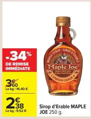 Actuellement en offre chez Carrefour : Sirop d'érable MAPLE JOE 250 g ✅ Valable du 20-01 au 2-02.