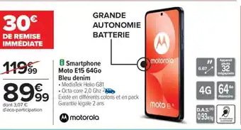 Smartphone Moto E15 64Go Bleu denim offres et promotions en ligne chez Carrefour