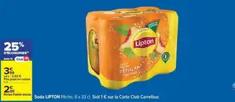 Actuellement en offre chez Carrefour : Soda LIPTON Pêche, 6 x 33 cl ✅ Valable du 24-02 au 9-03.