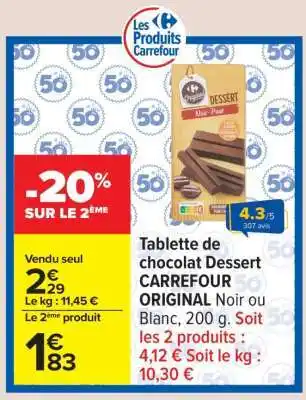Actuellement en offre chez Carrefour : Tablette de chocolat Dessert CARREFOUR ORIGINAL Noir ou Blanc, 200 g ✅ Valable du 20-01 au 2-02.