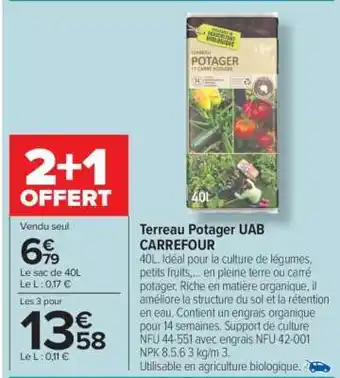Actuellement en offre chez Carrefour : Terreau Potager UAB CARREFOUR ✅ Valable du 10-03 au 23-03.