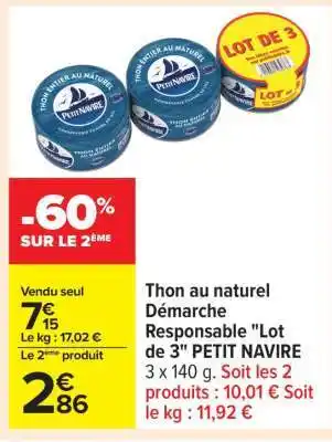 Actuellement en offre chez Carrefour : Thon au naturel Démarche Responsable Lot de 3 PETIT NAVIRE ✅ Valable du 13-01 au 26-01.