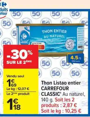 Actuellement en offre chez Carrefour : Thon Listao entier CARREFOUR CLASSIC’ ✅ Valable du 27-01 au 9-02.