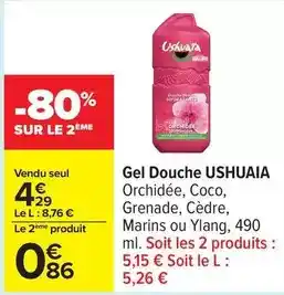 Actuellement en offre chez Carrefour : Ushuaia - gel douche ✅ Valable du 10-03 au 23-03.
