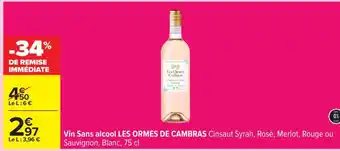 Actuellement en offre chez Carrefour : Vin Sans alcool LES ORMES DE CAMBRAS ✅ Valable du 13-01 au 26-01.