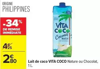 Vita coco - lait de coco nature ou chocolat offres et promotions en ligne chez Carrefour
