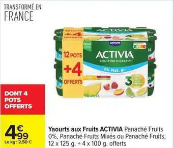 Quand Yaourts aux fruits activia sera-t-elle en promotion ? Ou encore : "Est-ce que Yaourts aux fruits activia sera en promotion la semaine prochaine ?" C’est une question fréquente. Beaucoup de consommateurs établissent leur liste de courses à l’avance. Pour cette raison, nous mettons en ligne les informations sur les promos à venir dès qu’elles sont connues. Cela vous permet de planifier vos achats et de faire de bonnes affaires. Consultez régulièrement notre site pour savoir si une nouvelle promo sur Yaourts aux fruits activia arrive bientôt chez Carrefour.Questions fréquemment posées au sujet de Yaourts aux fruits activia