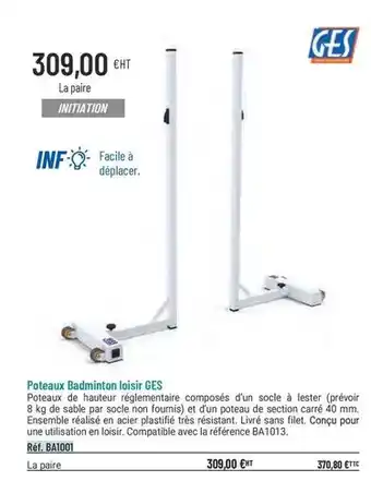 Ges - poteaux badminton loisir offres et promotions en ligne chez Casal Sport
