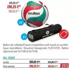 Le prix de l'offre Molten - ballon de volleyball haute competition soft-touch en synthè-tique microfibres se trouve également en haut de la page, ainsi que la date à laquelle l'offre est disponible. Vous pouvez également vérifier les prix dans le Catalogue Casal Sport actuel ou sur le site Internet de Casal Sport. Les offres vous permettent d'acheter les produits Casal Sport au prix le plus bas.