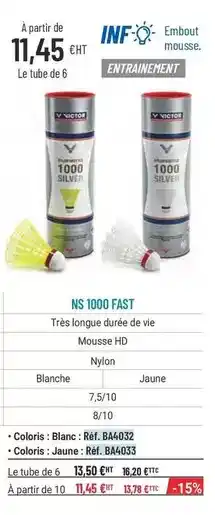 En plus de l'offre Victor - ns 1000 fast, Casal Sport propose une large gamme de produits. Consultez le Catalogue Casal Sport hebdomadaire pour découvrir les meilleures offres et promotions. En plus de Victor - ns 1000 fast, il y a aussi : Victor - ns 2000 fast, Victor - ns 2000 medium & Victor.