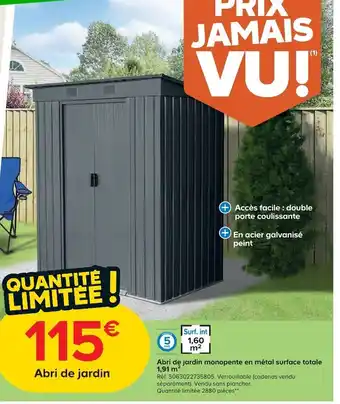 Actuellement en offre chez Castorama : Abri de jardin monopente en métal surface totale ✅ Valable du 25-02 au 17-03.