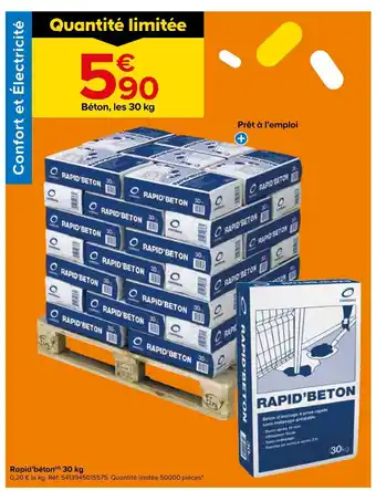 L'offre est disponible dans plusieurs magasins, vérifiez tous les produits pour obtenir le Béton le moins cher. Si vous souhaitez savoir si l'article est en vente avec une plus grosse remise dans un autre magasin, consultez la catégorie 'Bricolage'. Ces offres pourraient aussi vous intéresser : BÉTON Rapide, Béton ou mortier & Béton rapide 30kg(1).