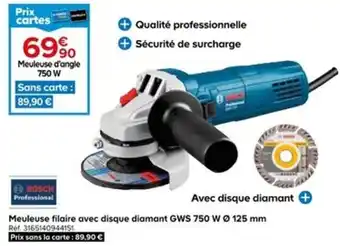 En plus de l'offre BOSCH Meuleuse filaire avec disque diamant GWS 750 W Ø 125 mm, Castorama propose une large gamme de produits. Consultez le Catalogue Castorama hebdomadaire pour découvrir les meilleures offres et promotions. En plus de BOSCH Meuleuse filaire avec disque diamant GWS 750 W Ø 125 mm, il y a aussi : Bosch professionnelle meuleuse filaire avec disque diamant gws 750 w ø 125 mm, Metabo meuleuse d'angle 125 mm + 1 disque diamant 850 w & Ryobi - meuleuse + disque diamant.