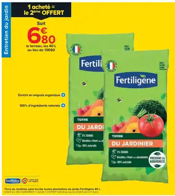 En plus de l'offre Fertiligène terre du jardinier sans tourbe toutes plantations du jardin 40 l, Castorama propose une large gamme de produits. Consultez le Catalogue Castorama hebdomadaire pour découvrir les meilleures offres et promotions. En plus de Fertiligène terre du jardinier sans tourbe toutes plantations du jardin 40 l, il y a aussi : FERTILIGÈNE Terre du Jardinier sans tourbe toutes plantations du jardin, Fertiligène - terreau naturel sans tourbe & Désherbant jardin cours allée fertiligène.
