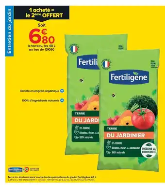 En plus de l'offre FERTILIGÈNE Terre du Jardinier sans tourbe toutes plantations du jardin, Castorama propose une large gamme de produits. Consultez le Catalogue Castorama hebdomadaire pour découvrir les meilleures offres et promotions. En plus de FERTILIGÈNE Terre du Jardinier sans tourbe toutes plantations du jardin, il y a aussi : Fertiligène terre du jardinier sans tourbe toutes plantations du jardin 40 l, Fertiligène - terreau naturel sans tourbe & Désherbant jardin cours allée fertiligène.