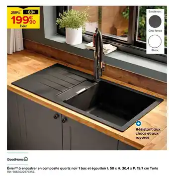 Quand Goodhome évier à encastrer en composite quartz sera-t-elle en promotion ? Ou encore : "Est-ce que Goodhome évier à encastrer en composite quartz sera en promotion la semaine prochaine ?" C’est une question fréquente. Beaucoup de consommateurs établissent leur liste de courses à l’avance. Pour cette raison, nous mettons en ligne les informations sur les promos à venir dès qu’elles sont connues. Cela vous permet de planifier vos achats et de faire de bonnes affaires. Consultez régulièrement notre site pour savoir si une nouvelle promo sur Goodhome évier à encastrer en composite quartz arrive bientôt chez Castorama.Questions fréquemment posées au sujet de Goodhome évier à encastrer en composite quartz