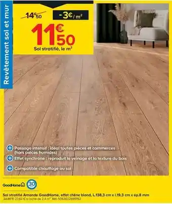 Actuellement en offre chez Castorama : Goodhome - sol stratifie amande, effet chene blond, l.138,3 cm x l.19,3 cm x ep.8 mm ✅ Valable du 25-02 au 17-03.