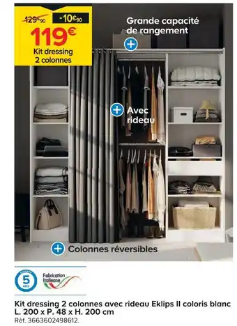 Actuellement en offre chez Castorama : Kit dressing 2 colonnes avec rideau eklips ii coloris blanc l. 200 x p. 48 x h. 200 cm ✅ Valable du 25-02 au 17-03.