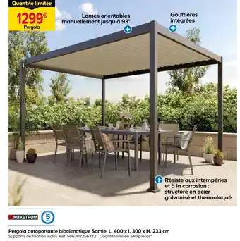 Actuellement en offre chez Castorama : Klikstrom pergola autoportante bioclimatique samiel ✅ Valable du 15-04 au 5-05.