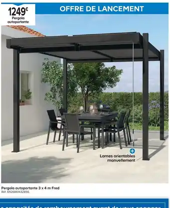 Actuellement en offre chez Castorama : Pergola autoportante 3 x 4 m Fred ✅ Valable du 25-02 au 17-03.