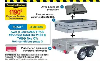 Actuellement en offre chez Castorama : Remorque avec réhausse pleine et bâche Trigano ✅ Valable du 25-02 au 17-03.