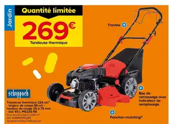 Dans quel magasin Scheppach tondeuse thermique tractée sera-t-elle en promo la semaine prochaine ? C’est une question que l’on nous pose souvent. C’est normal, car personne ne souhaite payer plus que nécessaire. Notre équipe surveille toutes les promotions disponibles et les publie dès qu’elles sont connues. Vous pouvez donc ajuster votre liste de courses avec les offres actuelles ou celles de la semaine prochaine. Revenez souvent vérifier si Scheppach tondeuse thermique tractée sera bientôt proposée avec une réduction avantageuse.Questions fréquemment posées au sujet de Scheppach tondeuse thermique tractée