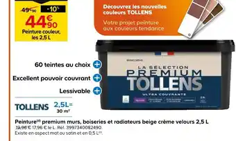 Actuellement en offre chez Castorama : Tollens peinture(d) premium murs, boiseries et radiateurs beige crème velours 2,5 l ✅ Valable du 15-04 au 5-05.