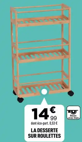 L'offre est disponible dans plusieurs magasins, vérifiez tous les produits pour obtenir le La dessert sur roulettes le moins cher. Si vous souhaitez savoir si l'article est en vente avec une plus grosse remise dans un autre magasin, consultez la catégorie 'Jardineries et Animaleries'. Ces offres pourraient aussi vous intéresser : Set de 4 roulettes, Valise à roulettes & KRAFT Set de roulettes.
