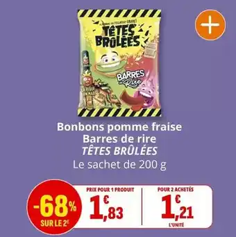 L'offre est disponible dans plusieurs magasins, vérifiez tous les produits pour obtenir le Bonbons pomme frat barres de rire le moins cher. Si vous souhaitez savoir si l'article est en vente avec une plus grosse remise dans un autre magasin, consultez la catégorie 'Supermarché'. Ces offres pourraient aussi vous intéresser : Bonbons pomme fraise barres de rire, TÊTES BRULÉES Bonbons barres de rire & BONBONS BARRES DE RIRE TÊTES BRÛLÉES.