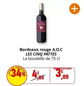 L'offre est disponible dans plusieurs magasins, vérifiez tous les produits pour obtenir le Bordeaux rouge a.o.c le moins cher. Si vous souhaitez savoir si l'article est en vente avec une plus grosse remise dans un autre magasin, consultez la catégorie 'Supermarché'. Ces offres pourraient aussi vous intéresser : Bordeaux rouge a.o.c, Bordeaux rouge a.o.c & Bordeaux rouge a.o.c les cinq pattes.