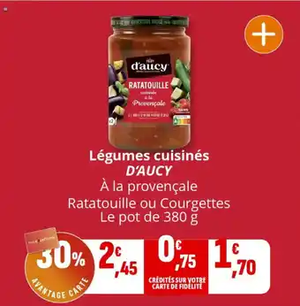 L'offre est disponible dans plusieurs magasins, vérifiez tous les produits pour obtenir le Légumes cuisinés d'aucy le moins cher. Si vous souhaitez savoir si l'article est en vente avec une plus grosse remise dans un autre magasin, consultez la catégorie 'Supermarché'. Ces offres pourraient aussi vous intéresser : D'AUCY Légumes cuisinés, D'AUCY Légumes cuisinés & Cassegrain légumes cuisinés.