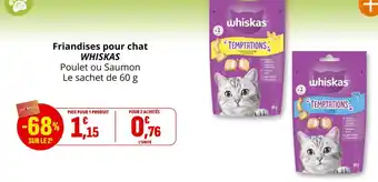 Friandises pour chat whiskas poulet ou saumon le sachet de 60 g