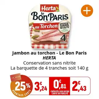 Actuellement en offre chez Coccinelle Supermarché : Jambon au torchon le bon paris herta ✅ Valable du 11-03 au 22-03.