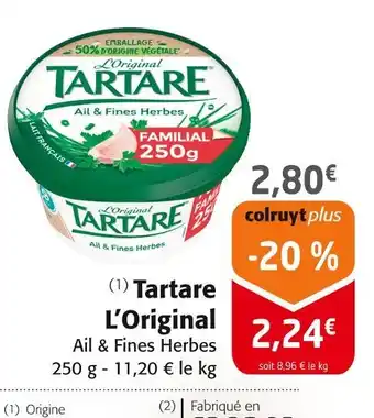 Le prix de l'offre Tartare l'original se trouve également en haut de la page, ainsi que la date à laquelle l'offre est disponible. Vous pouvez également vérifier les prix dans le Catalogue Colruyt actuel ou sur le site Internet de Colruyt. Les offres vous permettent d'acheter les produits Colruyt au prix le plus bas.