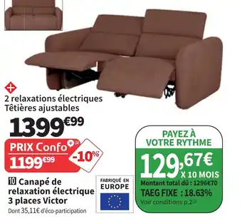 Actuellement en offre chez Conforama : Canapé de relaxation électrique 3 places Victor ✅ Valable du 24-02 au 30-03.