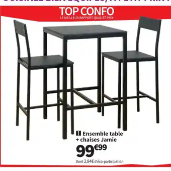 Le prix de l'offre Ensemble table + chaises Jamie se trouve également en haut de la page, ainsi que la date à laquelle l'offre est disponible. Vous pouvez également vérifier les prix dans le Catalogue Conforama actuel ou sur le site Internet de Conforama. Les offres vous permettent d'acheter les produits Conforama au prix le plus bas.