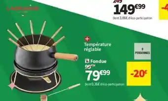 Quand Fondue sera-t-elle en promotion ? Ou encore : "Est-ce que Fondue sera en promotion la semaine prochaine ?" C’est une question fréquente. Beaucoup de consommateurs établissent leur liste de courses à l’avance. Pour cette raison, nous mettons en ligne les informations sur les promos à venir dès qu’elles sont connues. Cela vous permet de planifier vos achats et de faire de bonnes affaires. Consultez régulièrement notre site pour savoir si une nouvelle promo sur Fondue arrive bientôt chez Conforama.Questions fréquemment posées au sujet de Fondue