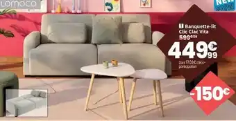En plus de l'offre Lomoco - clic de vita, Conforama propose une large gamme de produits. Consultez le Catalogue Conforama hebdomadaire pour découvrir les meilleures offres et promotions. En plus de Lomoco - clic de vita, il y a aussi : Banquette-lit Clic Clac Vita, Lomoco - lit adulte & Chapiteau clic clac.