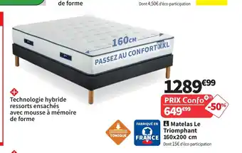 En plus de l'offre Matelas Le Triomphant, Conforama propose une large gamme de produits. Consultez le Catalogue Conforama hebdomadaire pour découvrir les meilleures offres et promotions. En plus de Matelas Le Triomphant, il y a aussi : Stellaire matelas, Matelas Exact 4 & Matelas Espiègle.