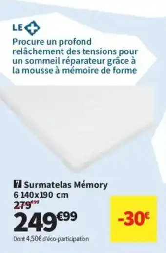En plus de l'offre Surmatelas Mémory, Conforama propose une large gamme de produits. Consultez le Catalogue Conforama hebdomadaire pour découvrir les meilleures offres et promotions. En plus de Surmatelas Mémory, il y a aussi : Surmatelas Memory 4, Carrelage memory & Surmatelas Ergo Indispensable.