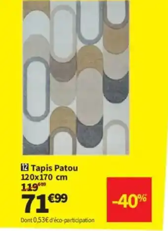 L'offre est disponible dans plusieurs magasins, vérifiez tous les produits pour obtenir le Tapis Patou le moins cher. Si vous souhaitez savoir si l'article est en vente avec une plus grosse remise dans un autre magasin, consultez la catégorie 'Meubles & Décoration'. Ces offres pourraient aussi vous intéresser : Tapis, Tapis & Tapis de bain.