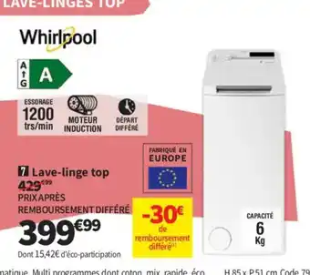 Actuellement en offre chez Conforama : WHIRLPOOL Lave-linge top ✅ Valable du 23-12 au 26-01.