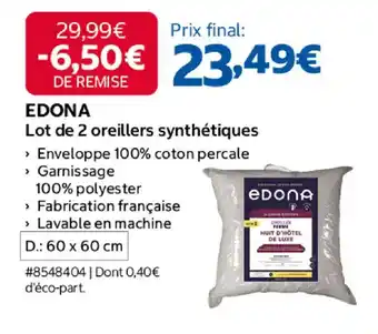 Le prix de l'offre EDONA Lot de 2 oreillers synthétiques se trouve également en haut de la page, ainsi que la date à laquelle l'offre est disponible. Vous pouvez également vérifier les prix dans le Catalogue Costco actuel ou sur le site Internet de Costco. Les offres vous permettent d'acheter les produits Costco au prix le plus bas.